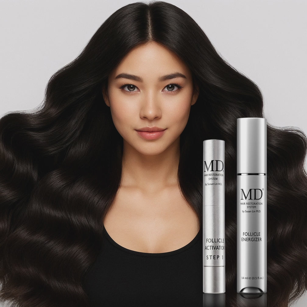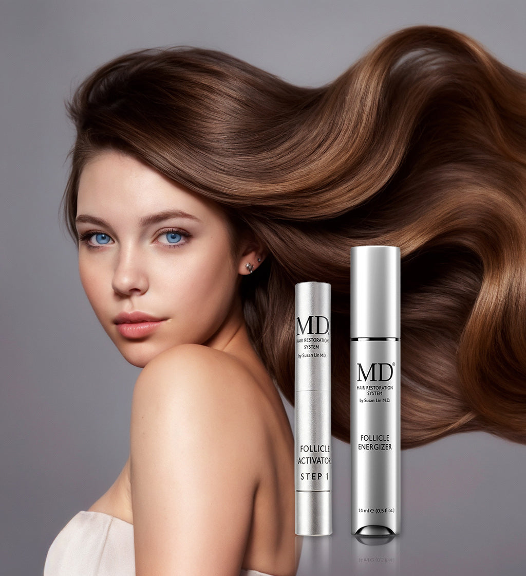 Experience visible transformation with MD Hair Revitalizing Serum Duo, a powerful, drug-free solution that reawakens dormant follicles, restores scalp vitality, and promotes thicker, healthier hair.